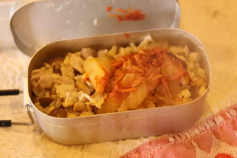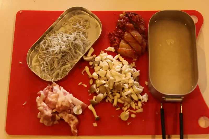 しらす干しは炊飯後に入れるのでそれ以外の材料をダイソーメスティンの中に入れます。鶏ガラスープも一緒に入れて蓋をします。