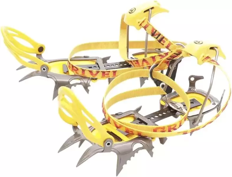 爪がやや短めで岩場でも歩きやすい縦走用12本爪。3番目が幅広でトラバース時にも安定感があります。つま先はプラスチックハーネス、踵はバインディング止めです。