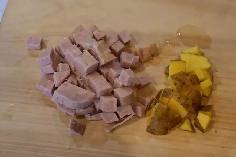 ポークランチョンミートは半分をさいの目切りにします。残りの半分はスライスして焼いて食べておつまみにできます。じゃがいもも同様にさいの目切りにします。