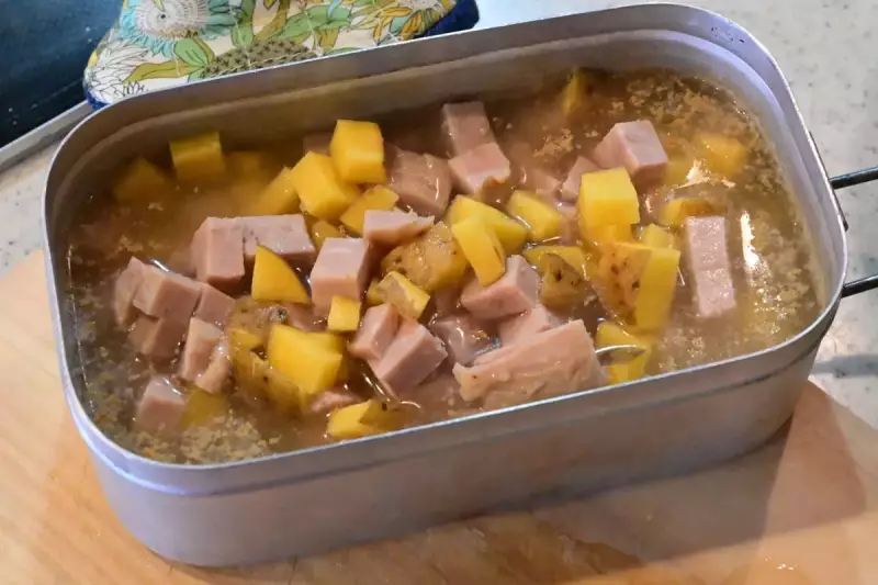 さいの目切りにした食材をメスティンに入れます。