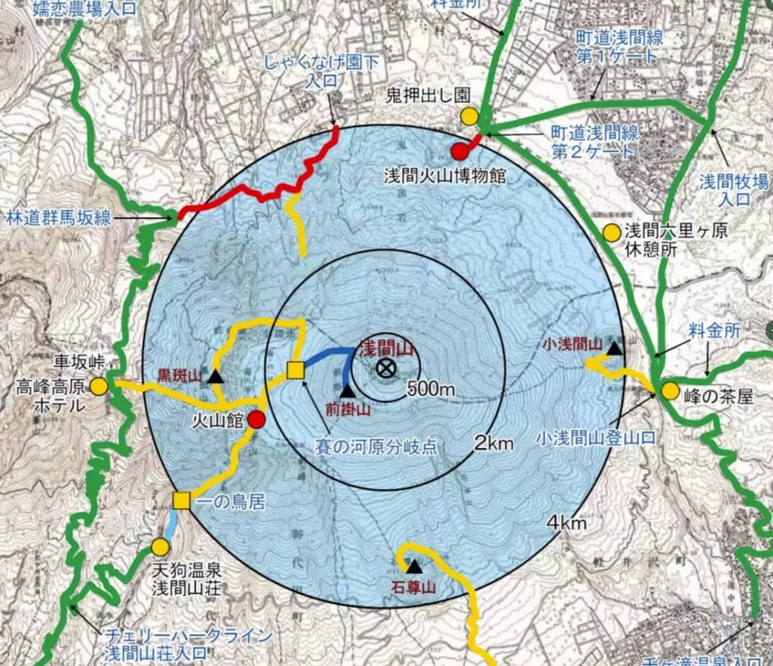 - 水色ライン:登山道であり、登山が可能な登山道(レベル3のときは状況により規制)
