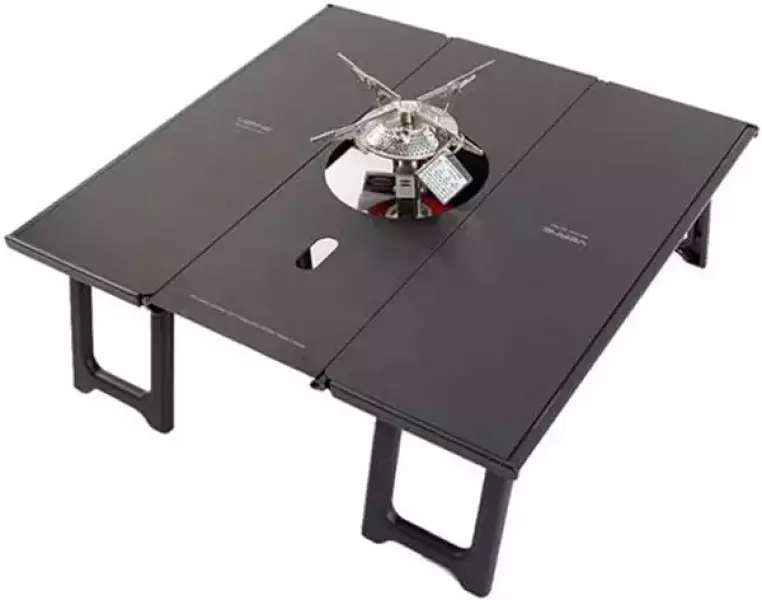 - 3分割されて持ち運びが便利なユニットテーブル。専用の足があれば何枚も繋げて利用することができます。こちらの販売ページは3枚1セットで真ん中のテーブルにOD缶を入れられるスペースがあり、安全に使用することができます。