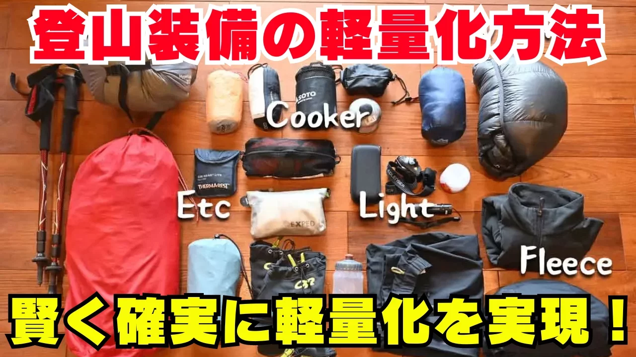 登山装備を軽量化する目的は、登山中の体の負担を軽減することです。登山装備が重いと、体力を使う、汗をかきやすくなる、自分の体力に合っていない重量の場合は転倒のリスクが増えるなど、余裕がない登山になってしまいます。装備を軽量化することで安全かつマイペースに登山を楽しむことが可能です。今回の動画では確実且つ賢く装備の軽量化をするために考えるべきことをステップごとで紹介をしていきます。
