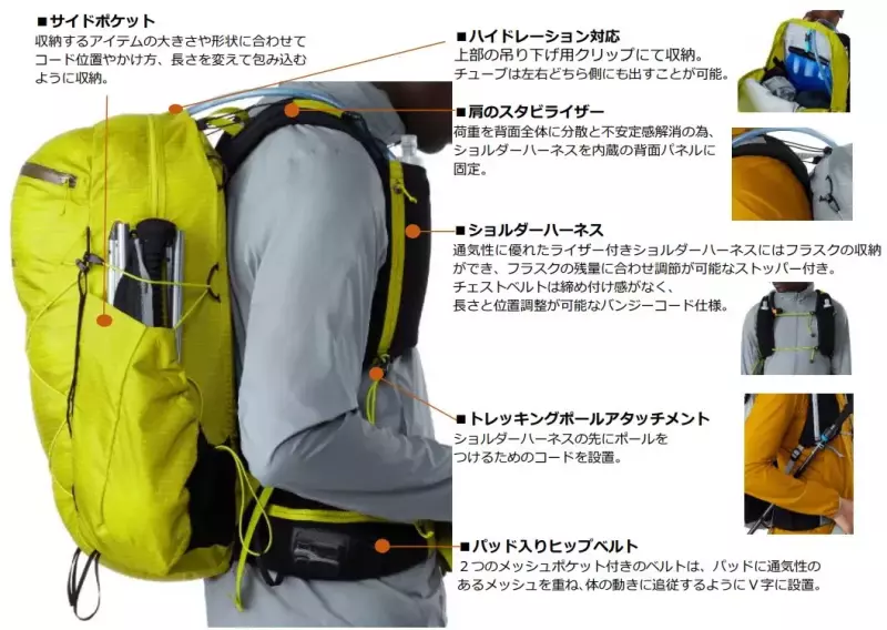 複数の外部ポケットは安全収納が可能なだけでなく、アイテムを出し入れしやすいスマートなデザイン性も魅力です。それぞれメンズ・ウィメンズを展開。背面長やヒップベルトの角度や形状、ショルダーハーネスの形状など、それぞれの体形の特徴に合わせ細かく設計しています。