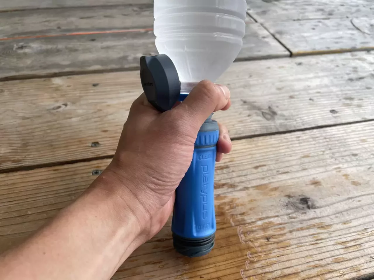 通常の飲料水ボトルにきれいな水を満たし、フィルターカートリッジのキャップを取り外します。そこに飲料水ボトルの飲み口を合わせると隙間なくぴったり合わさります。