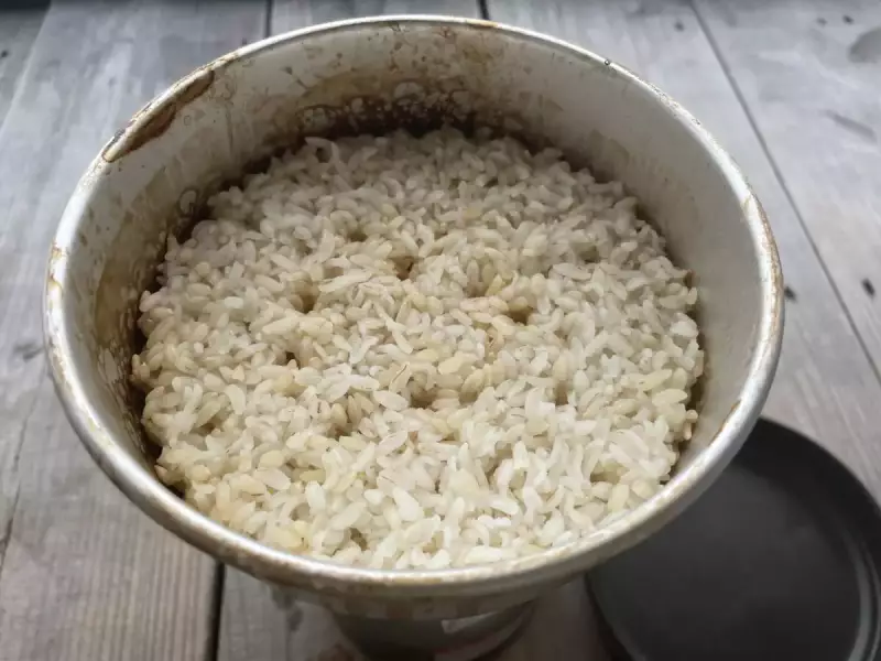 その後弱火で約10分炊飯します。トランギアのメスティンで炊飯をする際は約15分火を掛けるのですが、ミニトランギアで15分火にかけたら底と側面が焦げてしまいました。
