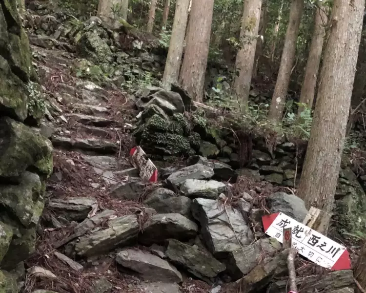 ロープーウェイを使用しないコースとして、西之川バス停から30mほど先の石段を山側へ登るコースがあります。一部廃屋になった数軒の家の前を通りながら石垣の途中を急に右に折れるのですが、間違って直進し岩原に行ってしまう登山者がいるため注意が必要です。