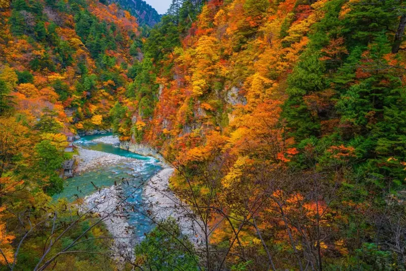北アルプスの山脈に挟まれた峡谷にある下ノ廊下は渓谷美と急峻な岩肌・青く透き通った黒部川・その中に色づく紅葉など色とりどりの景色は10月中旬をピークに楽しめます。下ノ廊下は黒部ダム建設の際に使用した作業用運搬道路。歴史あるトレッキングルートです。