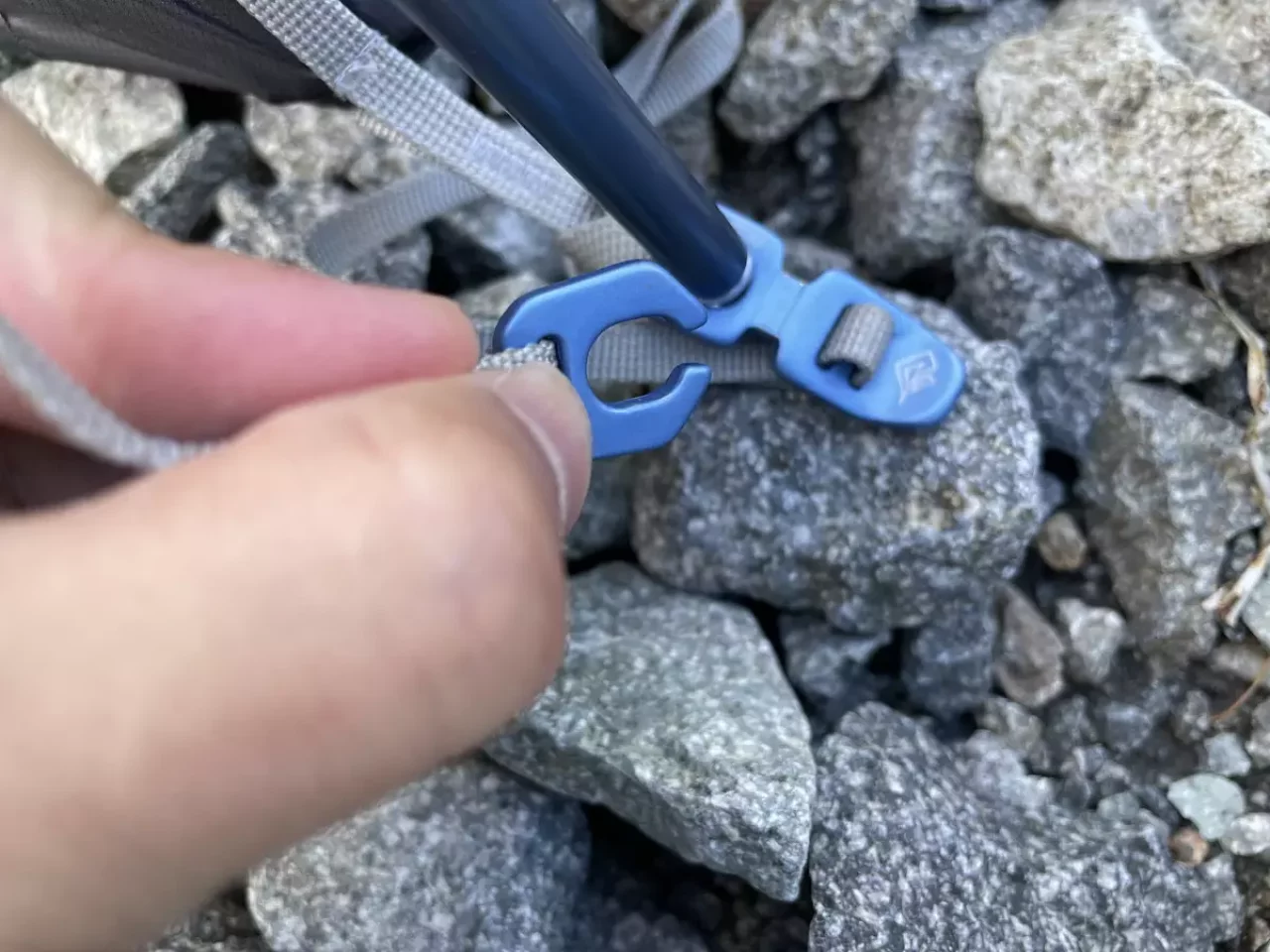 その後フライシートの末端に付いたフック状の金具をインナーテント側の金具に引っ掛けて行きます。色で分かれているのでフライシートの方向を簡単に定めることができます。