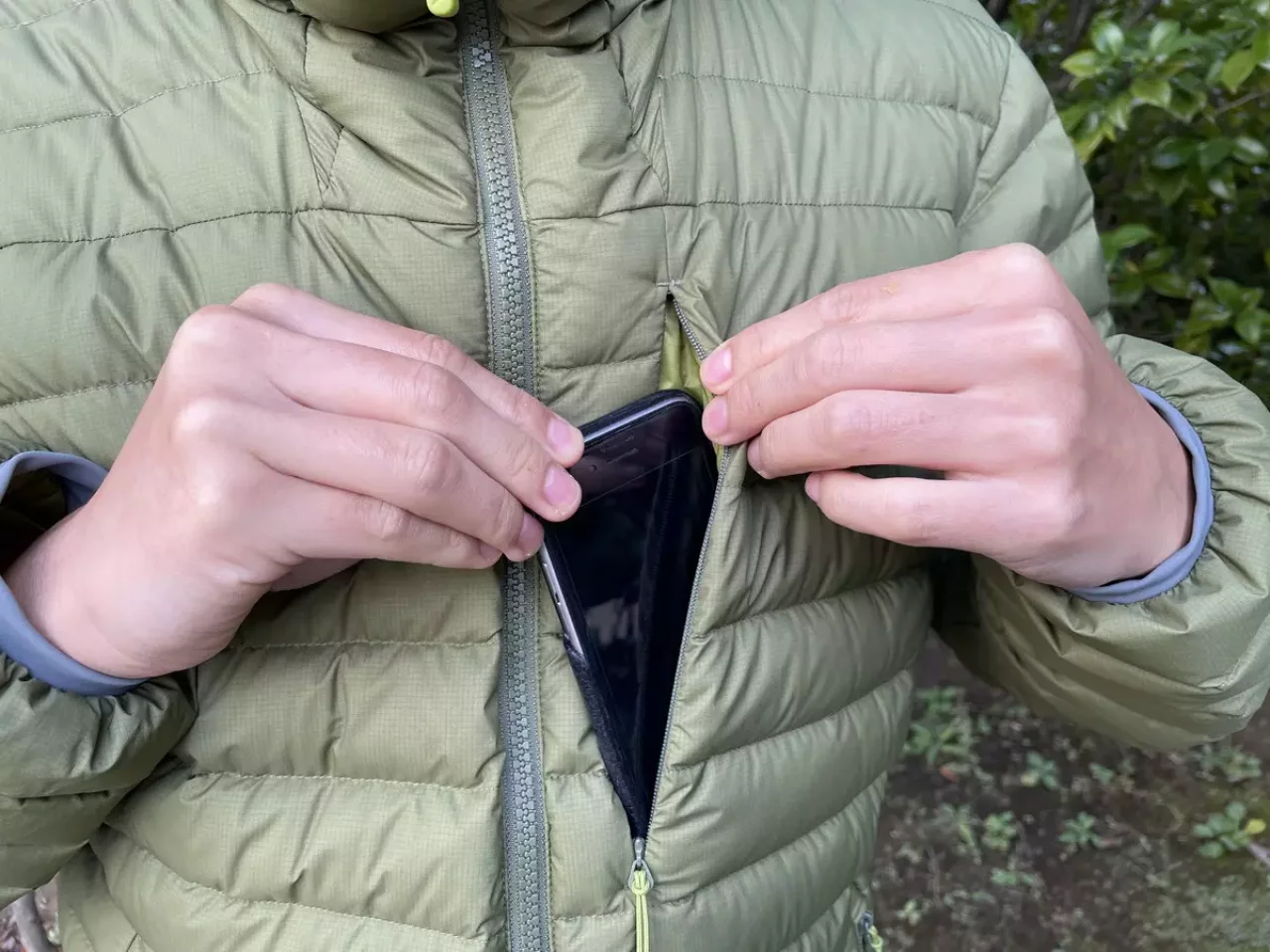 ポケットはハンドウォーマーポケットと胸ポケットが1つ。寒い場所でスマホを手を暖めるのに役立ちます。ハンドウォーマーポケットは大きめに作られているので、グローブなどを入れておくのにも便利です。
