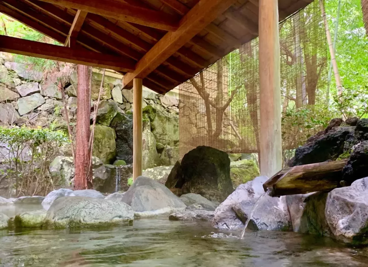 片品渓谷沿いに立つ湯元華亭。京都の庭師が作った、日本庭園の中に露天風呂がある。春に桜見、夏の新緑、秋は紅葉、冬には雪見温泉が楽しめる。自家源泉を持ち、老神温泉の2号線を使用。