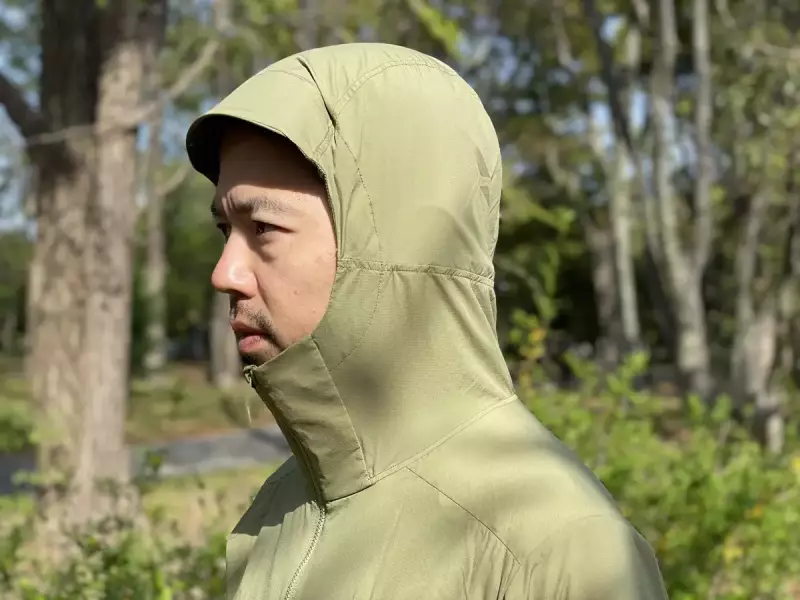 行動中に着用している時は、強く冷たい風に当たってもしっかりと体幹を温めてくれることがわかります。ジッパーを上げることで首元をしっかりと守るように作られています。