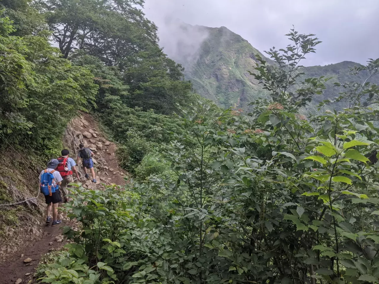 土合口からガレ沢のコルまで約2時間40分、長い樹林帯を歩いて行きます。ガレ沢のコルの手前には鎖場が出現するので注意して歩きましょう。