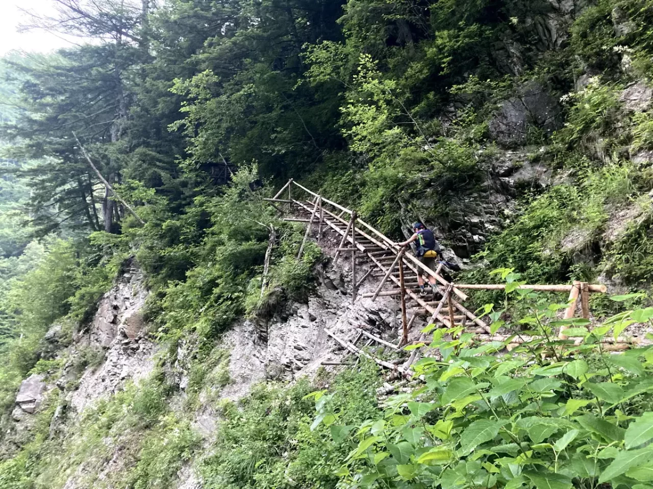 3日目は展望がない黒部源流を見ながらのハシゴ歩きが連続します。木の橋を渡り、はしごを使って高巻きし続けて平ノ渡場に向かいます。