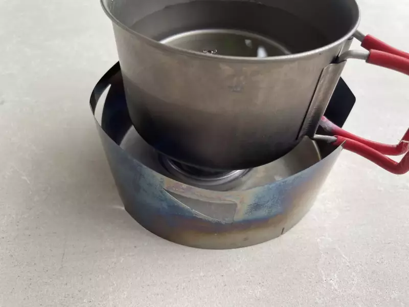 アルコールストーブはガスストーブや固形燃料と比べると風に弱いことが挙げられます。無風状態で約7分燃焼し400mlのお湯を沸かすことができるのですが、山では風が吹いているのでこのスペックを実現することは風防を使っても難しいです。