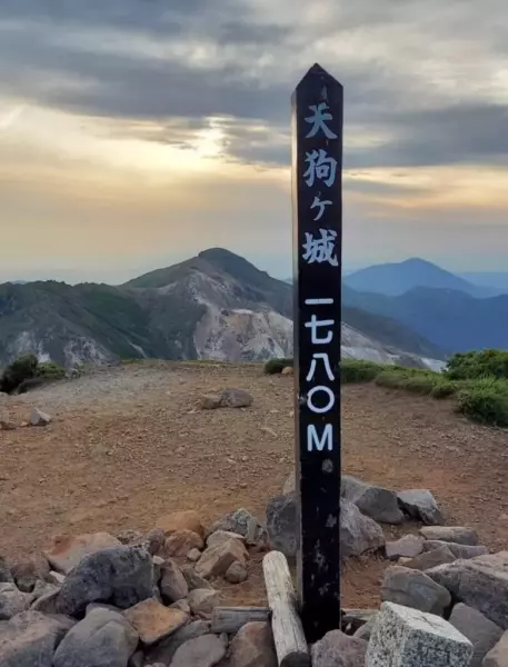 天狗ヶ城山頂です。夕暮れが近く、狙い通りの絶景です。