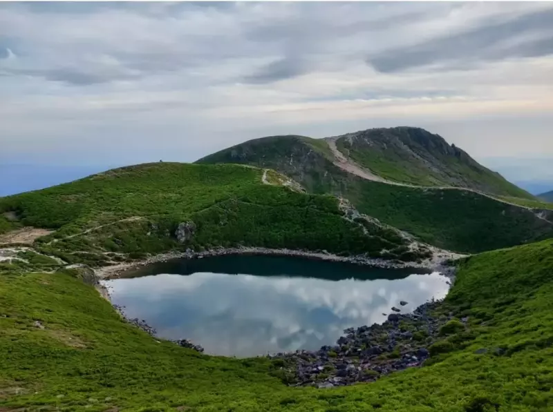 天狗ヶ城の手前から見た御池です。池の向こう側に見えるのが久住山です。