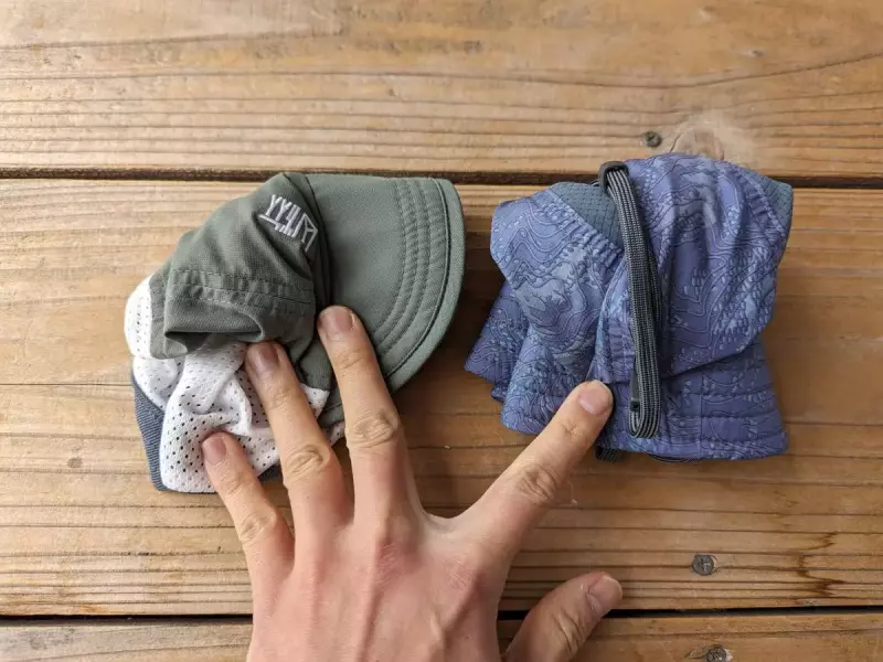 上の写真は山旅のキャップとSUNDAYafternoonの最も軽量なハットをコンパクトにした時のものです。手のひらに収まるほどコンパクトにすることができるタイプを選ぶことで、フードをかぶる時、ヘルメットをかぶる時にキャップやハットを外す時にポケットに入れやすく便利です。