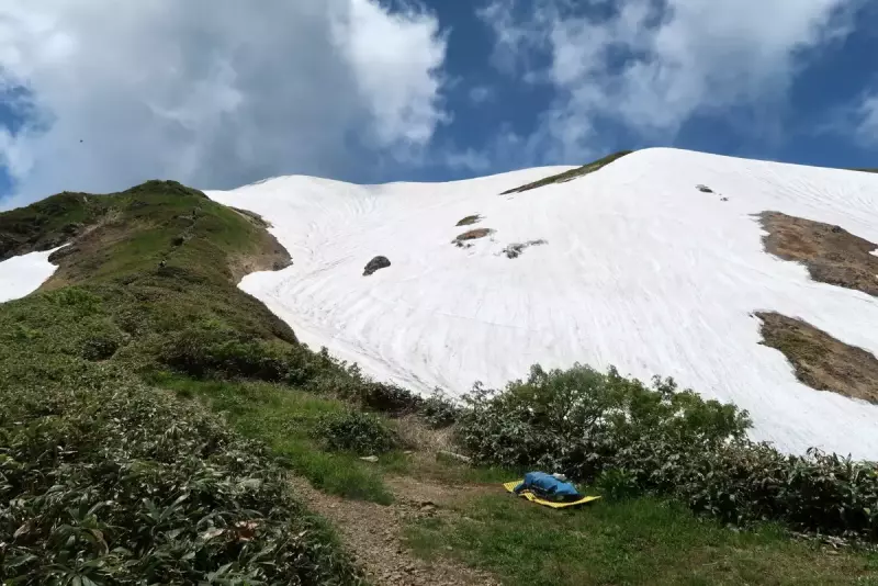 雪渓を下る涼風、絶景とともに頂く熱々カップ麺、かなり幸せな時間です。