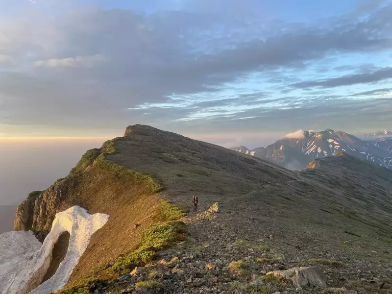 天狗平から天狗の頭、天狗の大下りまでは緩やかな稜線を歩いて行きます。4時から登山を開始したため、4時40分の日の出前と、日の出後の雄大な景色を思う存分楽しみながら陽線歩きを楽しみます。