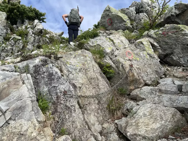 ゆっくりと足元を確かめながら鎖場を握って不帰嶮を登るシーンでは、足の力を使うため疲労感が蓄積されることを忘れないようにしましょう。