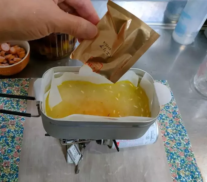 1.5合用のメスティンを準備。あればメスティン折りシートを敷くと後片づけが楽になります。着火すると忙しいので先にオリーブオイルを入れてしまいます。