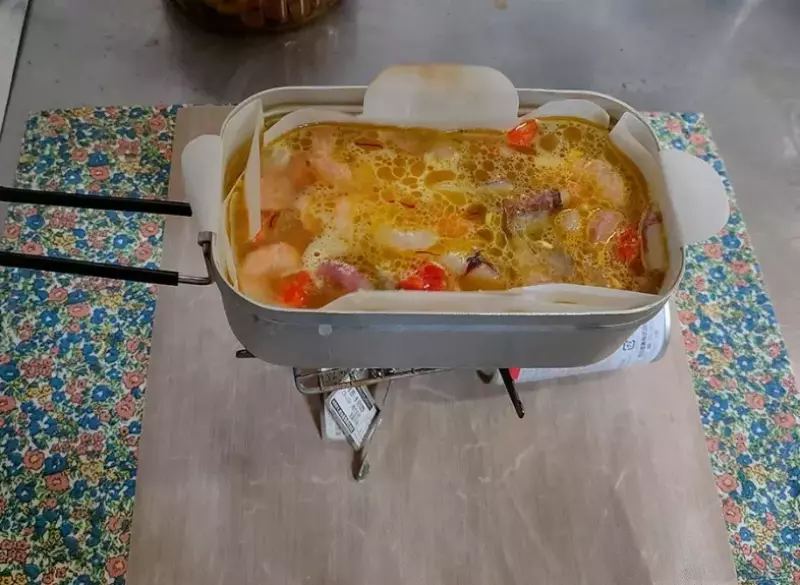 全部の具をお米の上に並べたら、混ぜないようにしてメスティンの蓋をして、弱火で15分炊飯します。