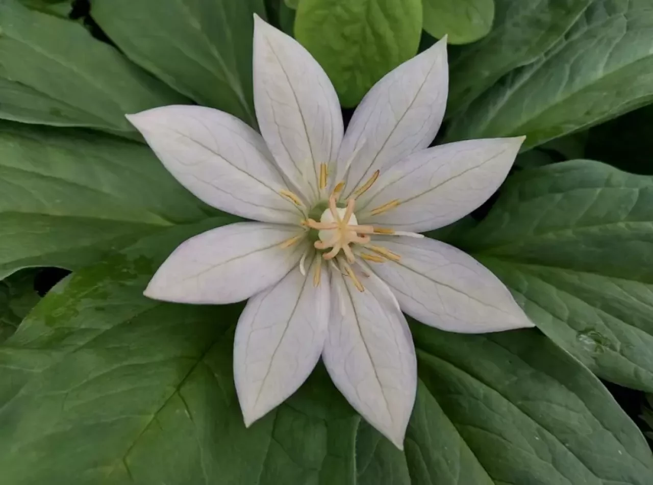 キヌガサソウ葉が、8~10枚、放射状につき、それが葉の傘のように見える。その葉姿を「衣笠」に見立てて「衣笠草」と言われています。日本の固有種で絶滅危惧種にも指定されています。高谷池湿原に群生しています。