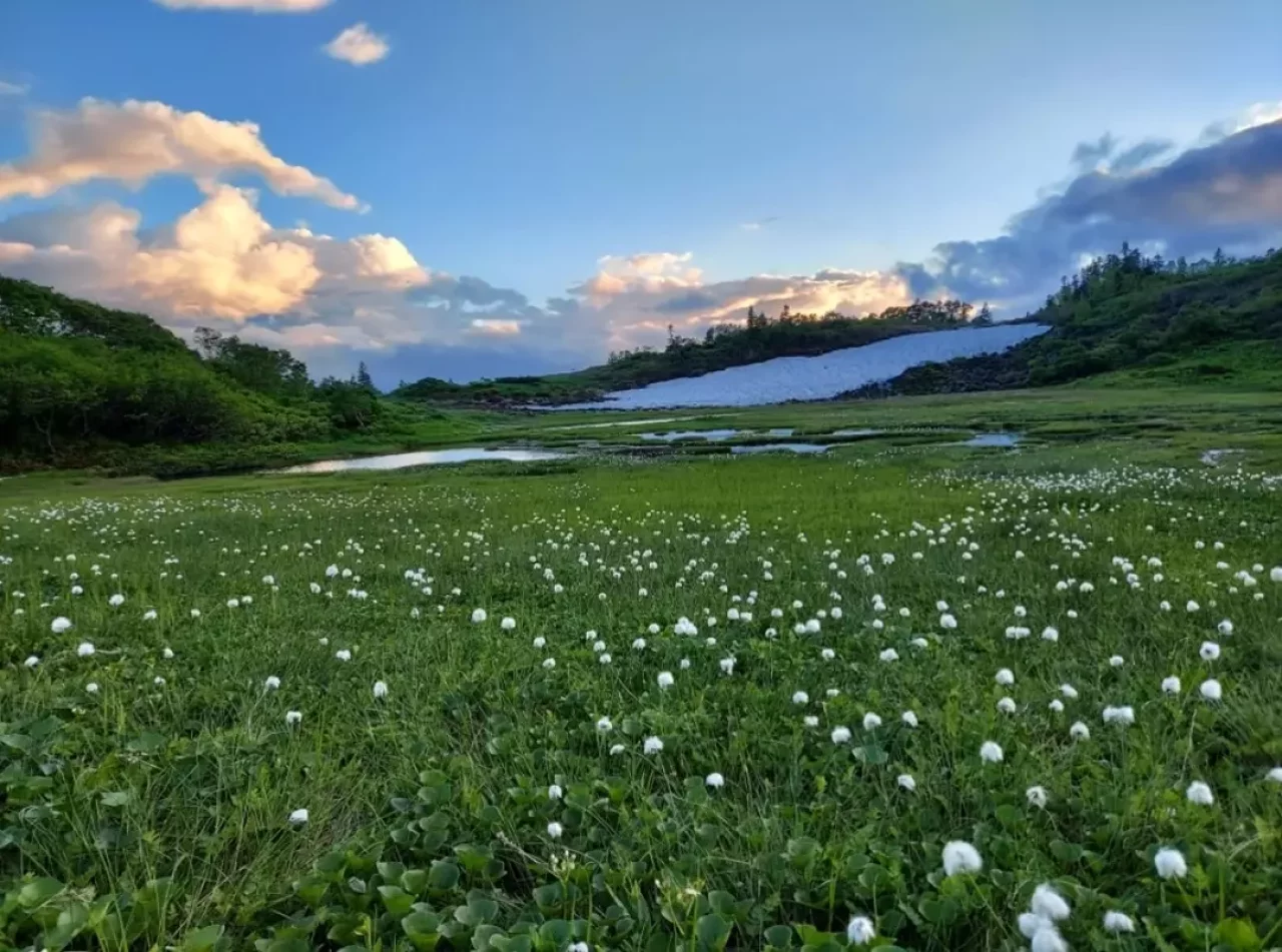 ワタスゲの群生地(天狗の庭)花期は5~6月。白い綿毛を付ける果期は6~8月。花が終わると白い綿毛を付けます。高層湿原に分布。