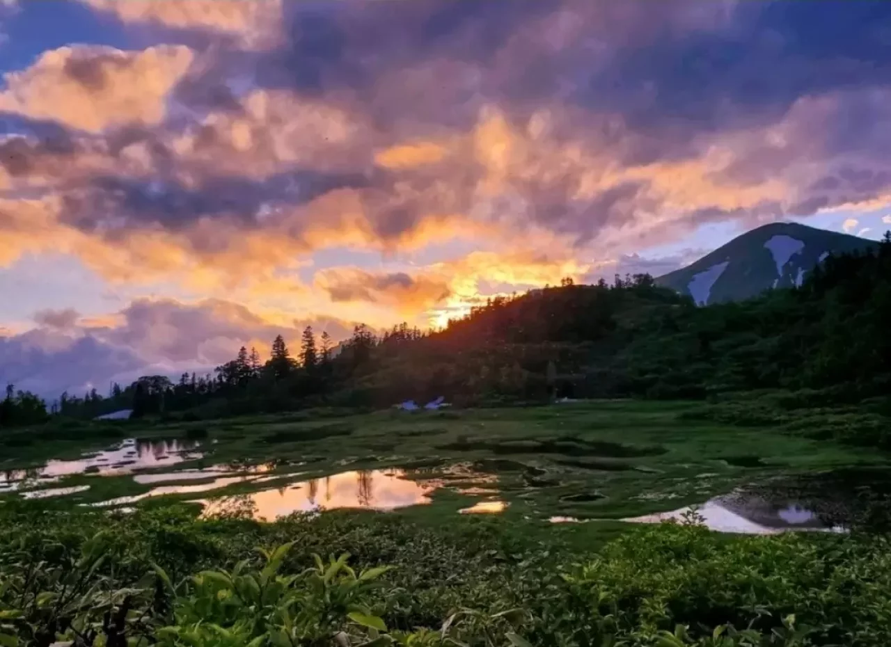 高谷池湿原まで戻りました。夕焼けの高谷池もまた素晴らしく綺麗です。