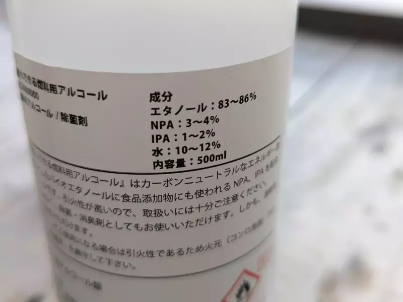 カーボンニュートラルなエネルギー源としてサトウキビを原料としたバイオエタノールに食品添加物にも使われるNPAと IPA を配合した燃料用アルコールです。火力もメタノール同等とうたわれており、燃料効率の高さとリスクが少ない特徴を備えた燃料です。このような理由から価格は高めですが、アウトドアショップなどでも販売されている人気のあるアルコール燃料です。