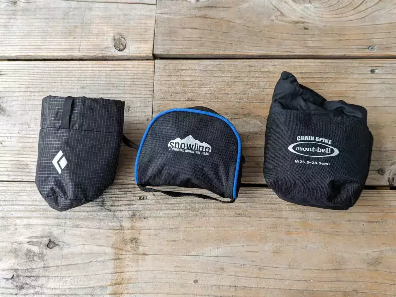 スノーラインにはアプローチシューズやトレイルランニングシューズ向けの軽量なチェーンスパイクと前の爪が先に2本前方に出ている爪の長さが特徴のチェーンスパイク、ベルクロストラップ付きのスタンダードタイプの3種類の展開です。