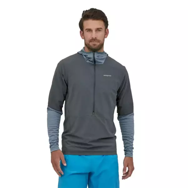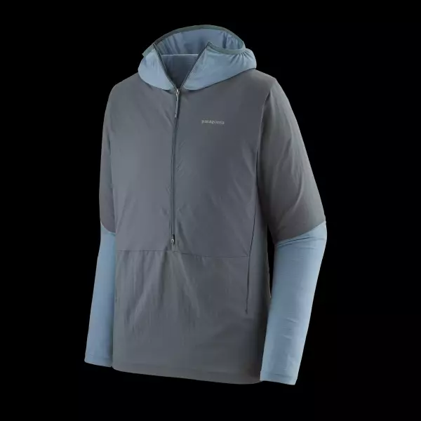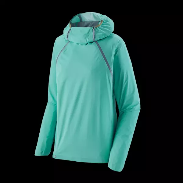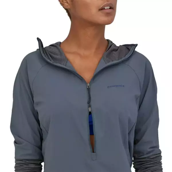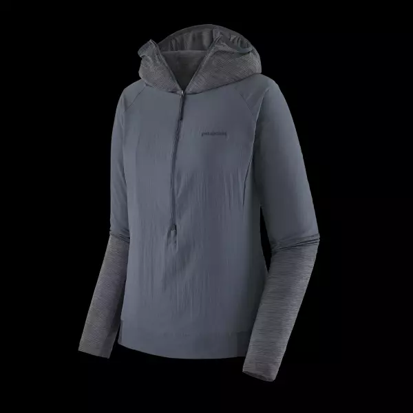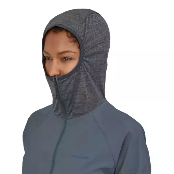 プルオーバータイプのフーディーで、フードと袖にキャプリーン・クール・ライトウェイト素材が使われています。袖は暑くなった時にまくり上げやすく、フードは軽量で走っていても邪魔になりません。程よく耳や頬を冷たい風から守ってくれます。