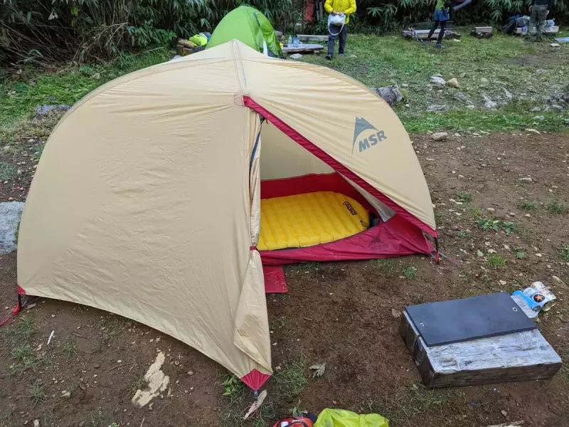 このようなテントを秋山登山で使用すると冷気の侵入でせっかく貯まった熱もどんどん奪われてしまいます。今回使用しているMSRのハバハバシールドは最小重量で1kgを切る軽さと、メッシュ地が少なく耐候性に優れたバランスに優れた山岳用テントで、季節のある日本の登山で安心して使えるテントです。