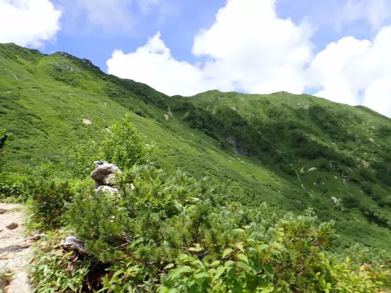 わさび平小屋以降はしばらく視界が開けます。北アルプスらしい風景に、つい顔が緩みます。