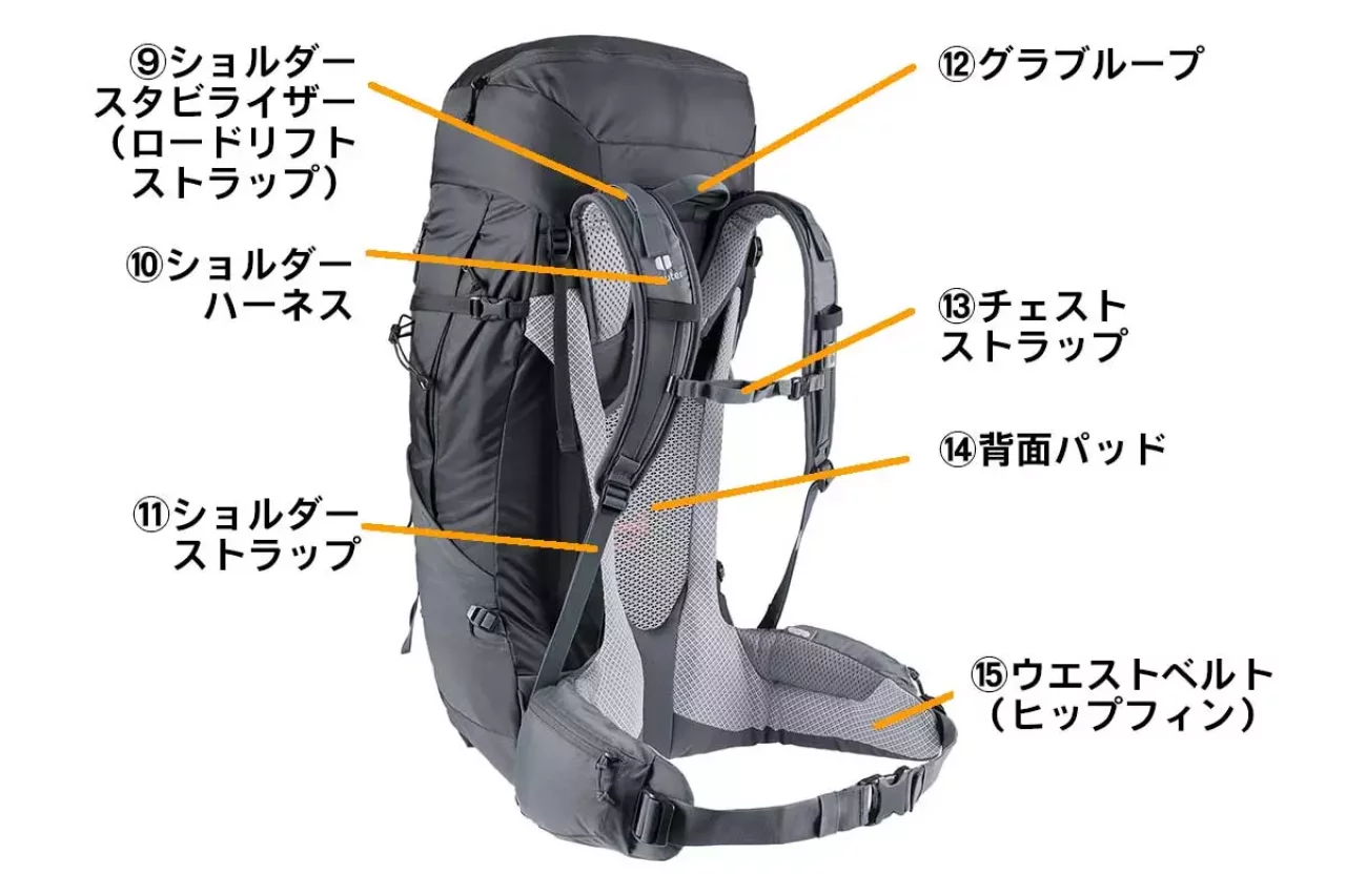 | ⑮ | 背面パッド | バックパックと背中があたる場所で、通気性によって背中にかいた汗を乾かす特徴を備えたバックパックがあります。 |