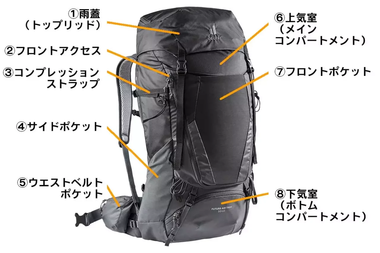 | ⑥ | 上気室 | 下気室が存在する場合、区別するために上気室と呼ばれます。メインコンパートメントとも言い、装備の多くを収納しておくためのスペースです。 |