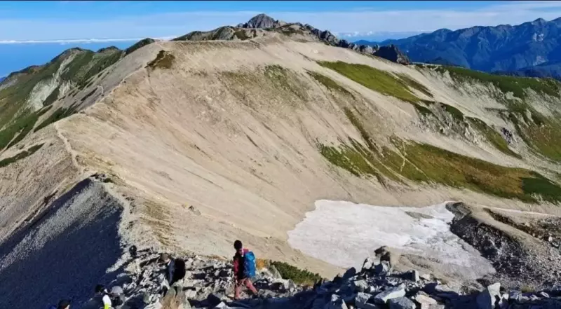 真砂岳へ続く稜線。内蔵助氷河がまだ残ってます。ここから、真砂岳、別山と歩いていきます。