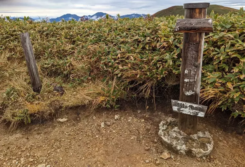 巻機山頂上からは左に行くと割引岳(わりめきだけ)に行くことができ、右に行くと牛ヶ岳となります。割引岳までは約1時間、牛ヶ岳までは約40分の道のりです。