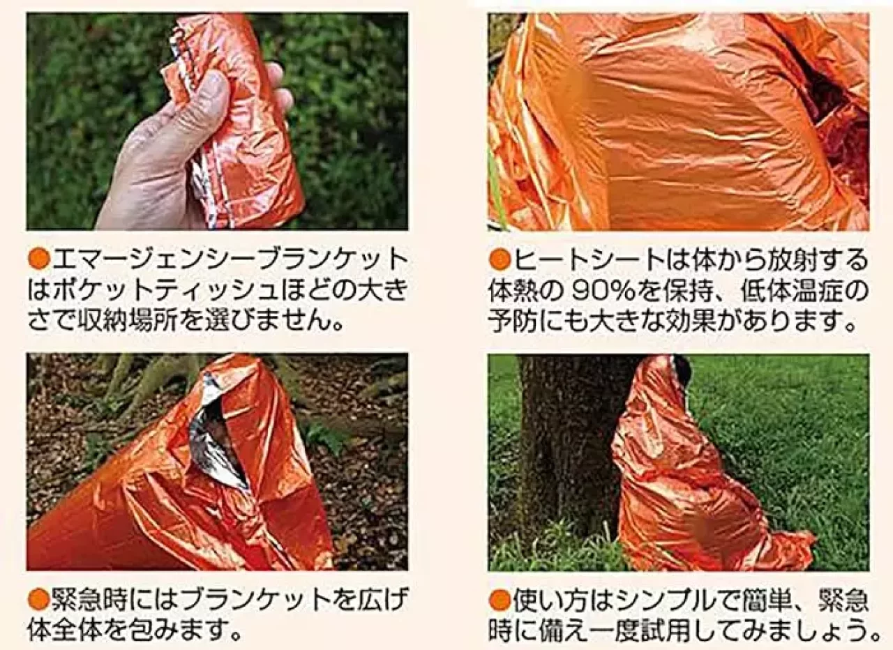 | エマージェンシーシート | 体の熱を外に逃がさず、反射熱で体を温めます。また濡れから体を守ります。 |