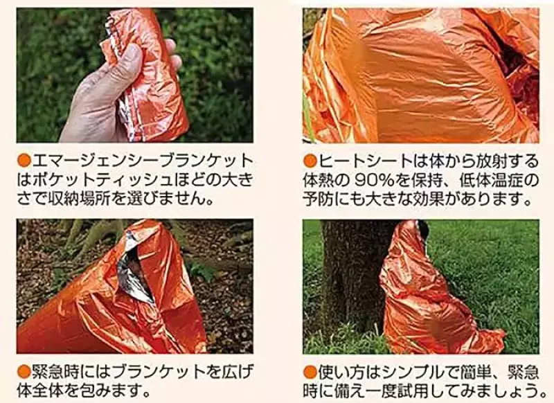 エマージェンシーシート | 体の熱を外に逃がさず、反射熱で体を温めます。また濡れから体を守ります。 |