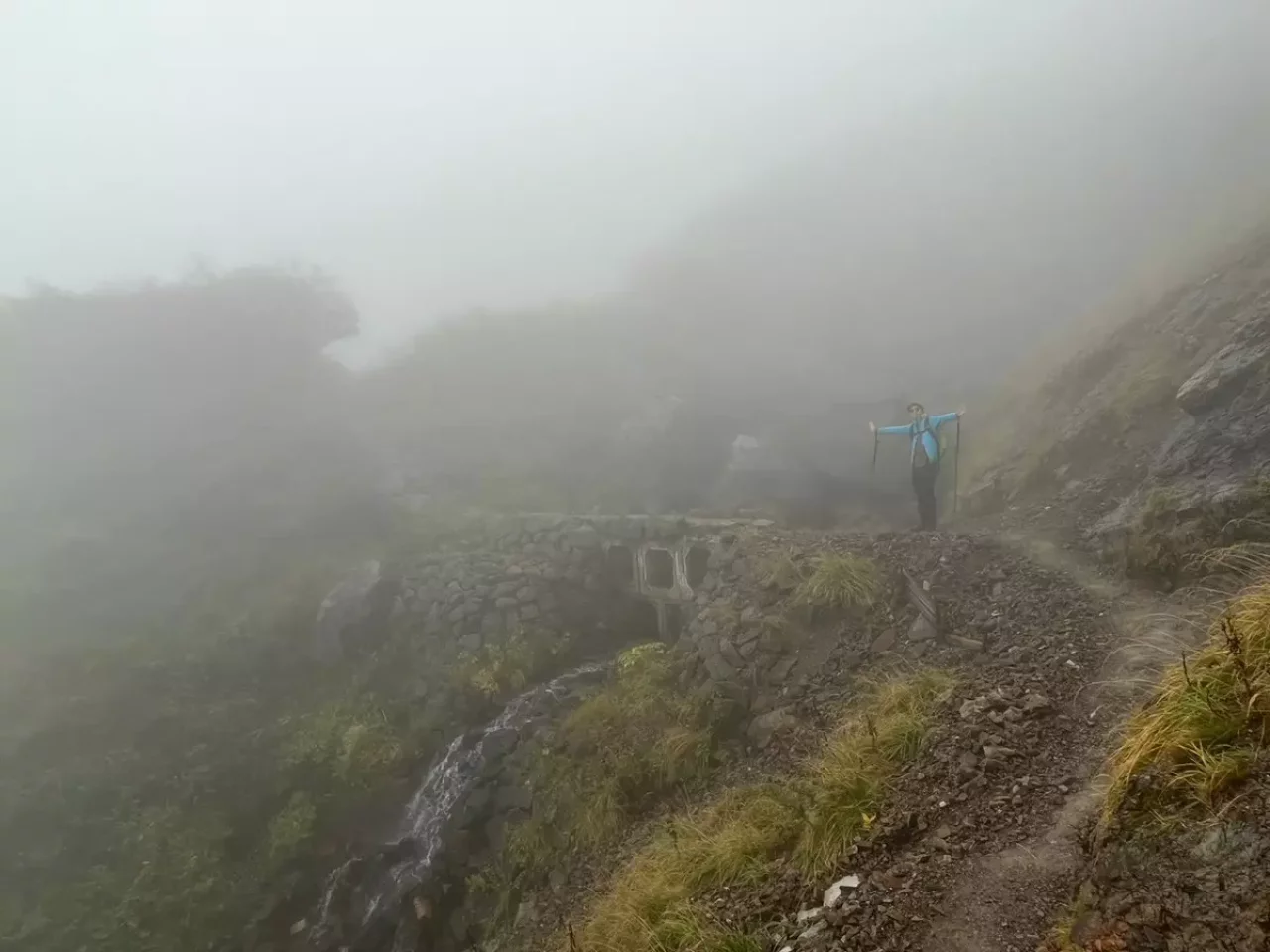 黒ボコ岩手前にある谷のトラバースも濃霧に覆われていて、素晴らしい景色は心の眼で。雨やら濃霧で辛かったけど急登もなんとかクリアし、黒ボコ岩到着。