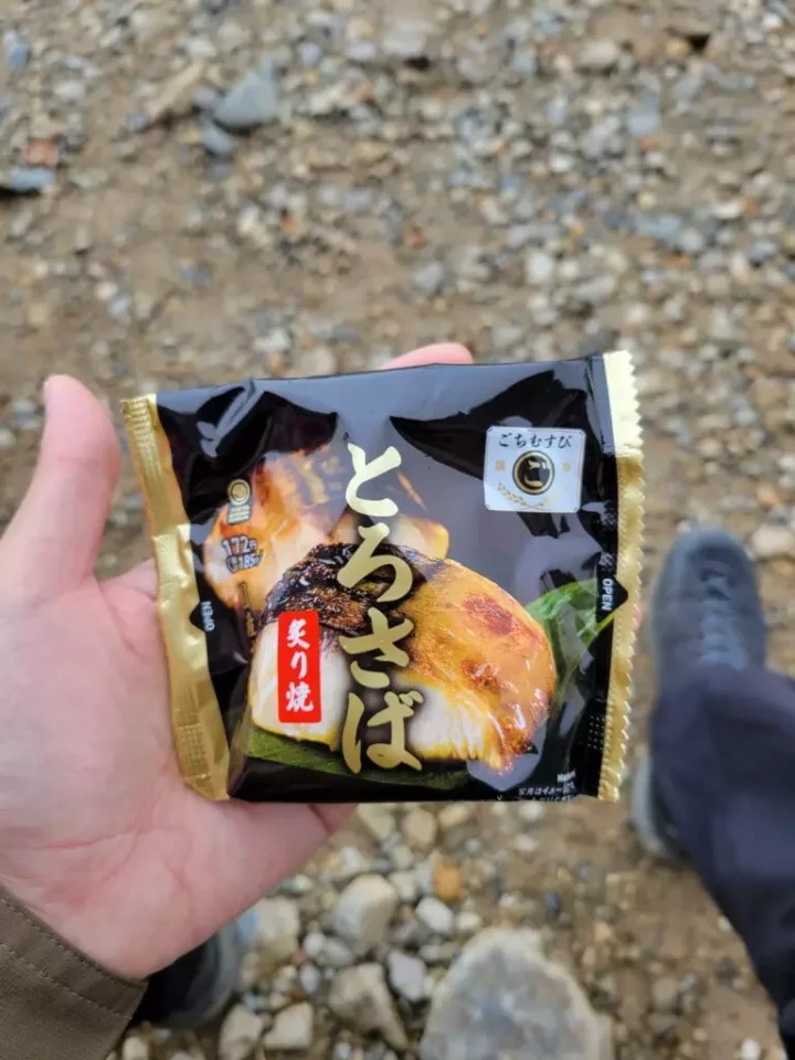 近くにいる人々と共に歓声をあげて写真撮ったら昼食休憩。最近山によく持っていく高級コンビニおにぎり。今回はトロサバ。名前の通りトロッとしたサバ。脂が美味しい。