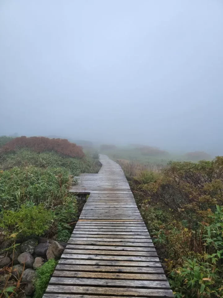 弥陀ヶ原の木道が雲海に向かって伸びて別世界に繋がっているよう。