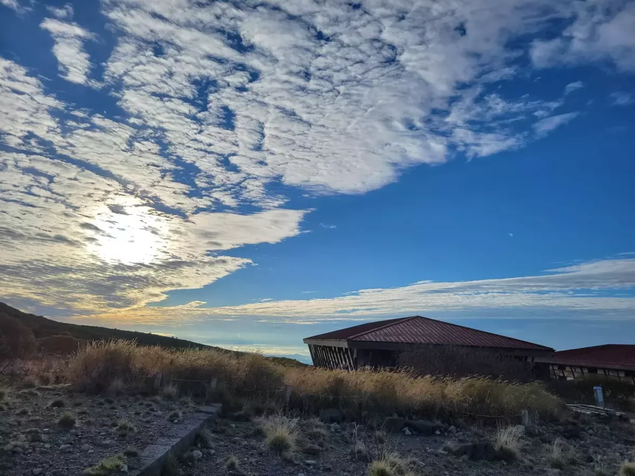 さすがにシャワーだけでは寒いので、部屋でぬくぬくストーブ点けて暖まっていたら外が明るくなってきた。慌てて外に出るとさっきまでのガスがはれて秋の山頂がはっきりと見える。