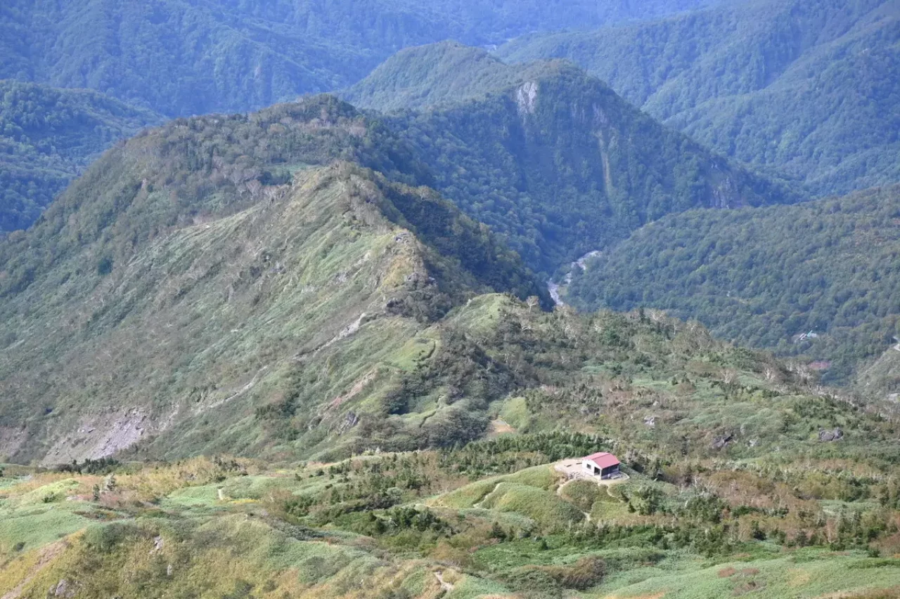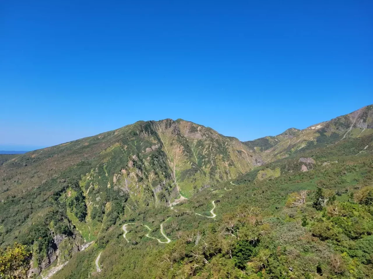 前日歩いた砂防新道が見える。そして別当坂分岐までの稜線がずっと続いていて、これから進む道を示してくれている。まずは見えている殿ヶ池避難小屋を目指す。