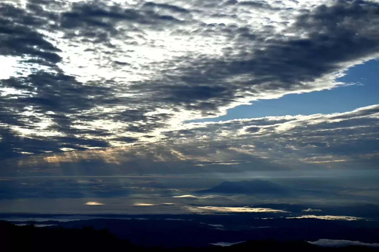 下っている途中にも雲はどんどん薄くなり雲の間から太陽が姿を現す。雲の隙間から溢れる光線は雲海と恵那山を照らすスポットライトのよう。天使の階段といわれています。