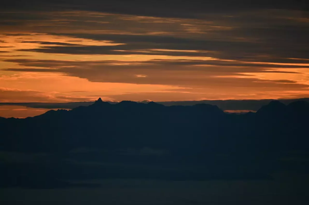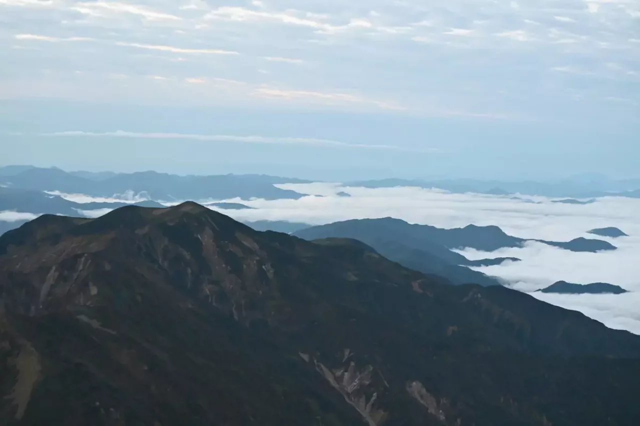 東の空が一層明るくなったので雲と雲の間から……、と期待が膨らんだが時間になっても御来光は遂に現れなかった。しかし、朝焼けにシルエットの槍ヶ岳、雲海に浮かぶ恵那山、前日は見られなかった大迫力の別山。たくさんの素晴らしい景色を眼に焼き付けた。
