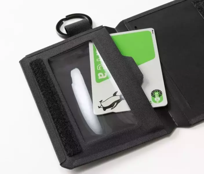 糸による縫製をせず、溶着のウエルディング技術で仕上げた近代的なデザインの財布です。登山ウェアのポケットに収納しても、滑りやすい素材なので取り出しやすいのも特徴です。本体の内側にはクリアウインドウのコインポケットとカードコンパートメントが1つあり、外側にもカードを収納できるホルダーがあり、普段遣いのしやすさにも気を配ったデザインです。