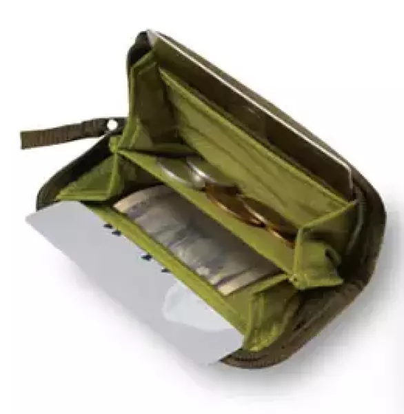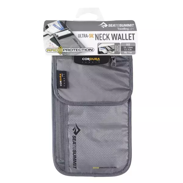 RFIDプルーフ生地が使用されたスキミング被害を防ぐ財布です。首からかけて持ち歩くことができる財布で2つのジッパーポケットと3つのポケットがあり、パスポートの収納にも適しています。登山シーンでは紙地図や行動食を入れておくことができます。